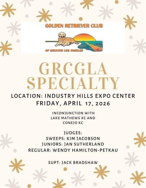 The Golden Retriever Club of Greater Los Angeles (GRCGLA) is a Member Club of the Golden Retriever Club of America (GRCA) and is approved by the AKC to hold licensed shows, obedience trials, hunt tests, and agility trials. The GRCGLA holds a Specialty Show and Obedience Trial semi-annually and also holds Licensed Hunt Tests, Agility Trials and WC/WCX tests. Meetings are held at least 6 times a year within the Greater Los Angeles area. Notice of all meetings is published in the Golden Gazette. Membership is obtained by attending two GRCGLA events including one meeting, having two member sponsors and being approved by the Board and General Membership. The GRCGLA is available as a resource for Golden Retriever Breeders and Puppies in Southern California.